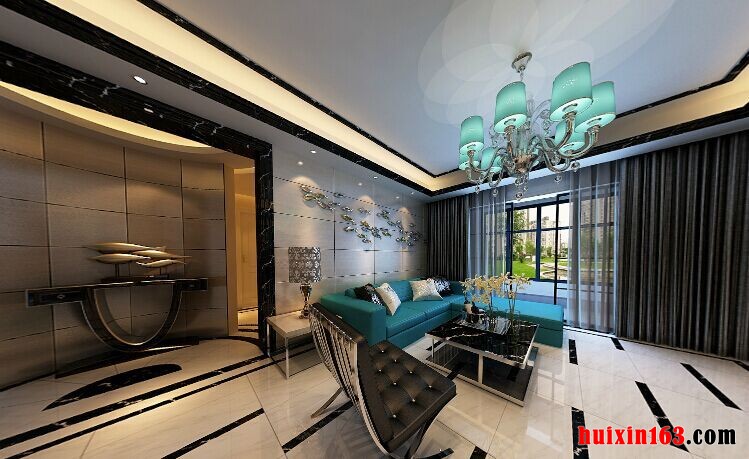 本案例虽说采用的是现代简约的装修风格,但通过设计师独具匠心的设计,对造型的布置以及色彩的搭配运用得活灵活现,例如客厅的装饰布置,采用平顶式的石膏板吊顶,背景色彩以白色为主,周边通过黑色的大理石来装饰,演绎出一种立体感,一盏绚丽的水晶吊灯更是凝聚着空间的视觉焦点,淡蓝色的灯罩无疑起到一个锦上添花的效果,拼贴式的地砖铺贴,局部通过黑色来加以点缀,也演绎出一种流动感,电视背景的后方就是餐厅的设计,其装饰格局与客厅的布置基本如出一辙,但营造出来的效果都展现出一种美不胜收的视觉感观,茶几上花卉的摆放也显得比较舒适。