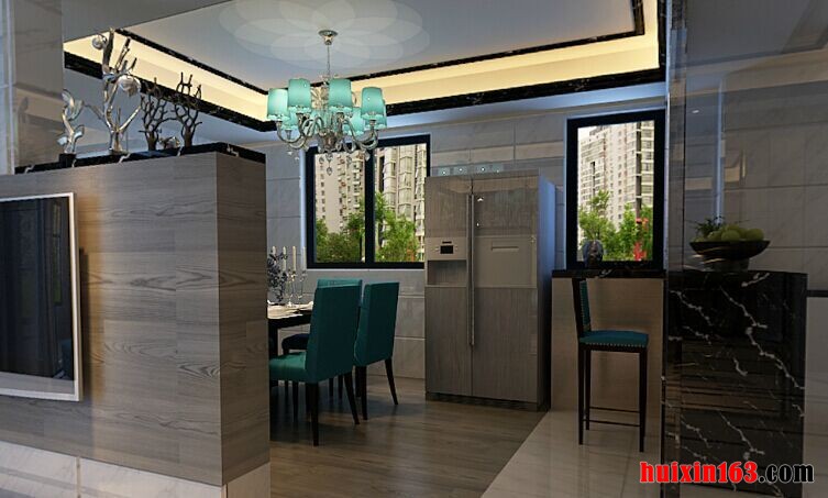 本案例虽说采用的是现代简约的装修风格,但通过设计师独具匠心的设计,对造型的布置以及色彩的搭配运用得活灵活现,例如客厅的装饰布置,采用平顶式的石膏板吊顶,背景色彩以白色为主,周边通过黑色的大理石来装饰,演绎出一种立体感,一盏绚丽的水晶吊灯更是凝聚着空间的视觉焦点,淡蓝色的灯罩无疑起到一个锦上添花的效果,拼贴式的地砖铺贴,局部通过黑色来加以点缀,也演绎出一种流动感,电视背景的后方就是餐厅的设计,其装饰格局与客厅的布置基本如出一辙,但营造出来的效果都展现出一种美不胜收的视觉感观,茶几上花卉的摆放也显得比较舒适。
