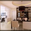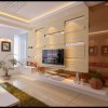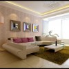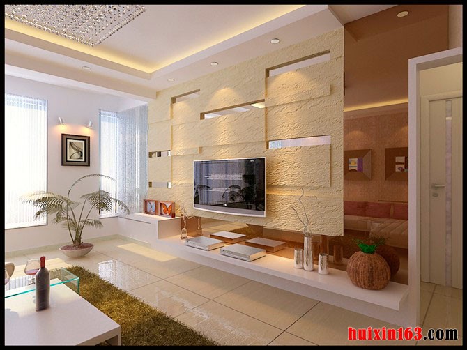 客厅的装饰设计具有非常清晰的层次感,线条硬朗,充满了现代时尚的冲击感。在客厅的顶面上装饰了一圈明亮的金黄色的灯带,中央是水晶帘装饰的方形的吊灯区域,给人清凉明快的感受。在电视背景墙上采用石膏板规划出凹凸有致的墙面,搭配一些长条的镜面,具有非常奇特的光影效果。电视柜的设计感觉像是一个特别长的整体,在客厅里面摆放上装饰南瓜,漂亮的植物,类似草坪的地毯,将现代和自然很好的糅合在了一起。