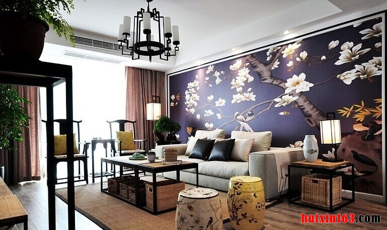在本案例的设计当中,既有着现代简约的时尚感,也有着中式风的稳重效果,例如客厅的装饰设计,采用平顶式的石膏板吊顶,背景色彩以白色为主,搭配上一盏个性、别致的吊灯,让空间展现出一种独特的美感,落地窗的设计搭配上轻质的窗帘,让空间的采光更加的明亮透彻,实木铺设的地板搭配上一张棕色的地毯,鲜明的色彩反差正好与吊顶上下相互呼应,个性的沙发背景墙铺贴上一张别致的壁画,惟妙惟肖的喜鹊被展现得栩栩如生,恰到好处的绿植添加摆放,通过盎然的绿意衬托环境,更是活跃了空间的氛围,沙发的造型也比较引人注目。