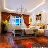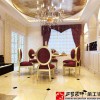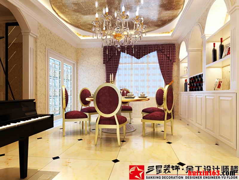 本套为欧美风格装修,餐厅地面采用的是大理石装修,墙面采用的是墙纸进行装修,吊顶采用石膏板进行平顶吊顶,加以水晶灯做装饰,餐厅的旁边有一台黑色的钢琴,美观的钢琴弹奏出优美动人的声音,空间设计设摒弃了繁琐与奢华,将欧式源于与现代空间完美融合,把传统过于复杂和讲究的欧式造型提炼并赋予其更强的设计感,餐厅天花上的圆代表着设计师对业主朋友的深深祝福。