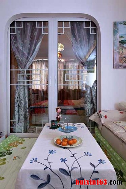 家居空间虽小,合理的设计并没有让家居显得拥挤拘束。白色的电视柜,集电视柜与储物柜与一身,收纳功能强大,可满足生活收纳所需。电视盘的小摆件及卡通玩具造型烟灰缸,小巧可爱且实用,让家居更显精彩。实木地板铺地,绿色花纹地毯过渡,淡淡的绿颜色带来舒适的视觉冲击感,米白色简约皮质沙发,动物图案靠枕及坐垫搭配,带给人温馨可爱、舒适与暖意,看着就让人心情舒畅。沙发背景墙上,长幅风景画装饰,生动自然的画风,让人很容易产生错觉,这并不是一幅画,就是墙上有窗户,画中美丽迷人的海边美景就在窗外,为室内增添了不少新鲜感。透明玻璃滑动卧室拉门设计,让家居显得宽敞了许多,拉开窗帘,打开滑动拉门,一切豁然开朗,双面印花窗帘,不管是打开还是随意扎起,都能起到装饰的作用。门口过的全身镜设计,方便家居主人出门前整理仪容,新的一天由此开始。